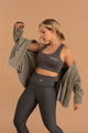 Top deportivo de mujer en color oliva, hecho de lycra elástica que se adapta a diferentes tipos de cuerpo, con escote en U y una banda inferior doble. Diseñado con tecnología de compresión para un mejor ajuste. Fabricado con telas inteligentes de alta densidad y suaves para brindar comodidad durante el ejercicio y evitar transparencias incómodas al hacer sentadillas o flexiones. Ideal para combinar con nuestros Pure Leggings o cualquiera de nuestros leggings.